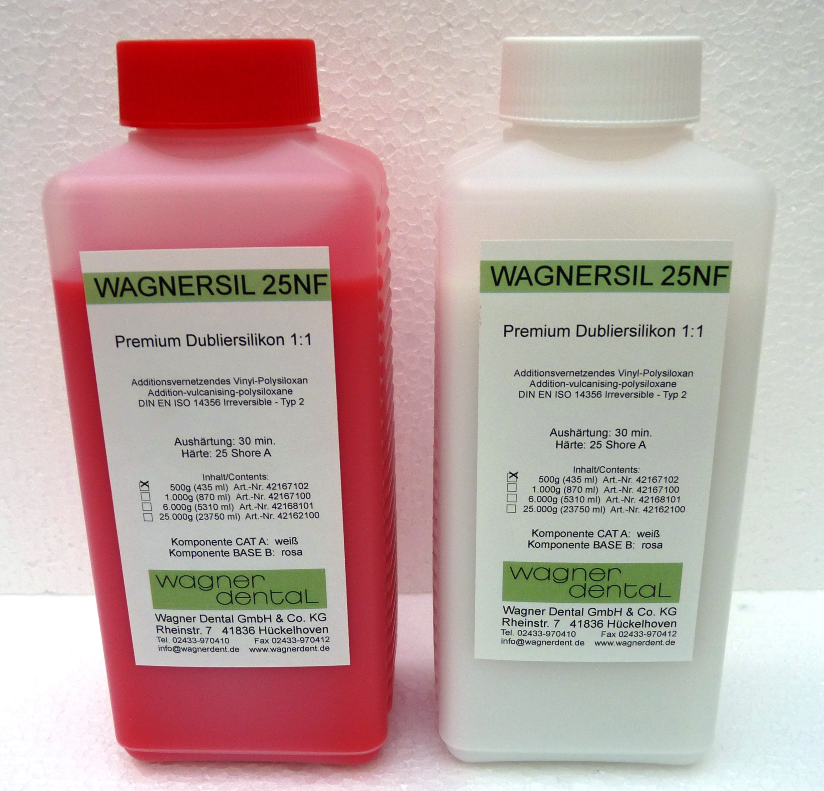 WAGNERSIL ist ein additionsvernetzendes 1:1 Dubliersilikon (RTV 2K Silikonkautschuk) mit den Endhärten 9-35 Shore A. Es ist niedrigviskos mit besten mechanischen Eigenschaften. WAGNERSIL dient zur Herstellung äußerst dimensions- und detailgenauer Silikonabformungen. WAGNERSIL hat in der Endkonsistenz eine sehr hohe Reißfestigkeit und ist sehr flexibel. Das Modell lässt sich daher leicht entformen, insbesondere bei Unterschnitten. WAGNERSIL erfordert keine Benetzungsmittel. Durch die Additionsvernetzung mit einem Platin-Katalysator in der A-Komponente härtet das Silikon schrumpfungsfrei und geruchlos aus. WAGNERSIL ist auch für die küvettenfreie Technik sehr gut geeignet. WAGNERSIL kann einfach und leicht sowohl im Gewichtsverhältnis als auch im Volumenverhältnis 1:1 vermischt werden. WAGNERSIL kann mit fast allen Vergussmassen mehrfach ausgegossen werden. Wagnersil ist bis 200°C Temperaturbeständig, kurzzeitig bis 250°C. WAGNERSIL ist hervorragend geeignet für alle Abformungen/Moulds in den Bereichen Industrie, Handwerk und Hobby.