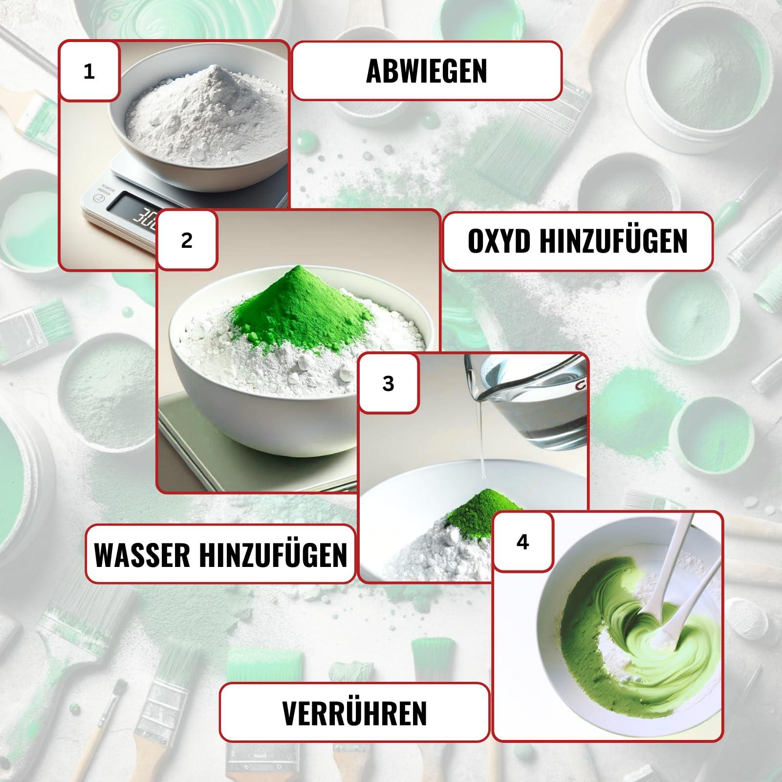- Einfache Verwendung: Kann direkt mit Trockenmaterialien, Anmischflüssigkeiten oder fertigen Mischungen kombiniert werden, je nach gewünschter Intensität 3-8% des Pigments zugeben.