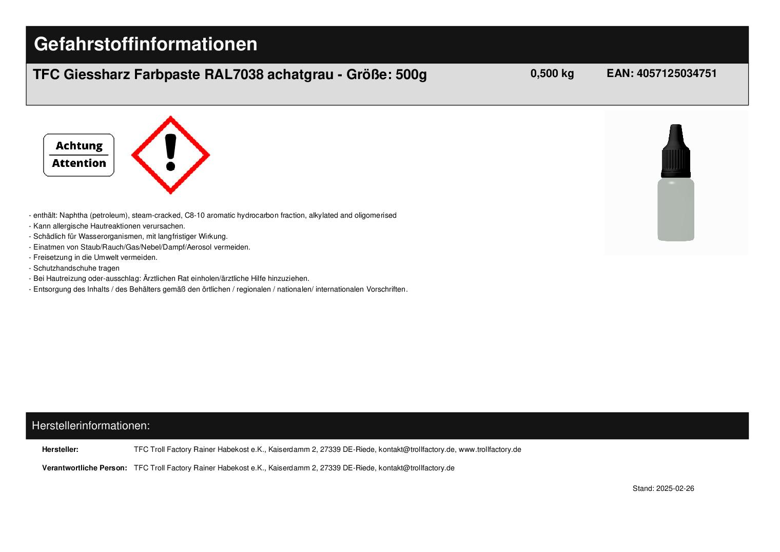 - TFC Giessharz Farbpasten werden vollständig in die Matrix eingebunden und weisen eine hohe Temperaturstabilität auf.