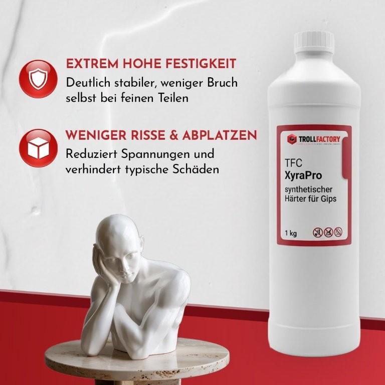 Unser synthetischer Härter verbessert die mechanischen Eigenschaften unserer Gipse (TFC Xyrarock, TFC Xyraflix, TFC Xyrastone und TFC Alabastergips) deutlich. Er erhöht die Druck- und Oberflächenfestigkeit, reduziert Abrieb und sorgt für langlebige, stabile Formteile – ohne die Verarbeitbarkeit negativ zu beeinflussen.