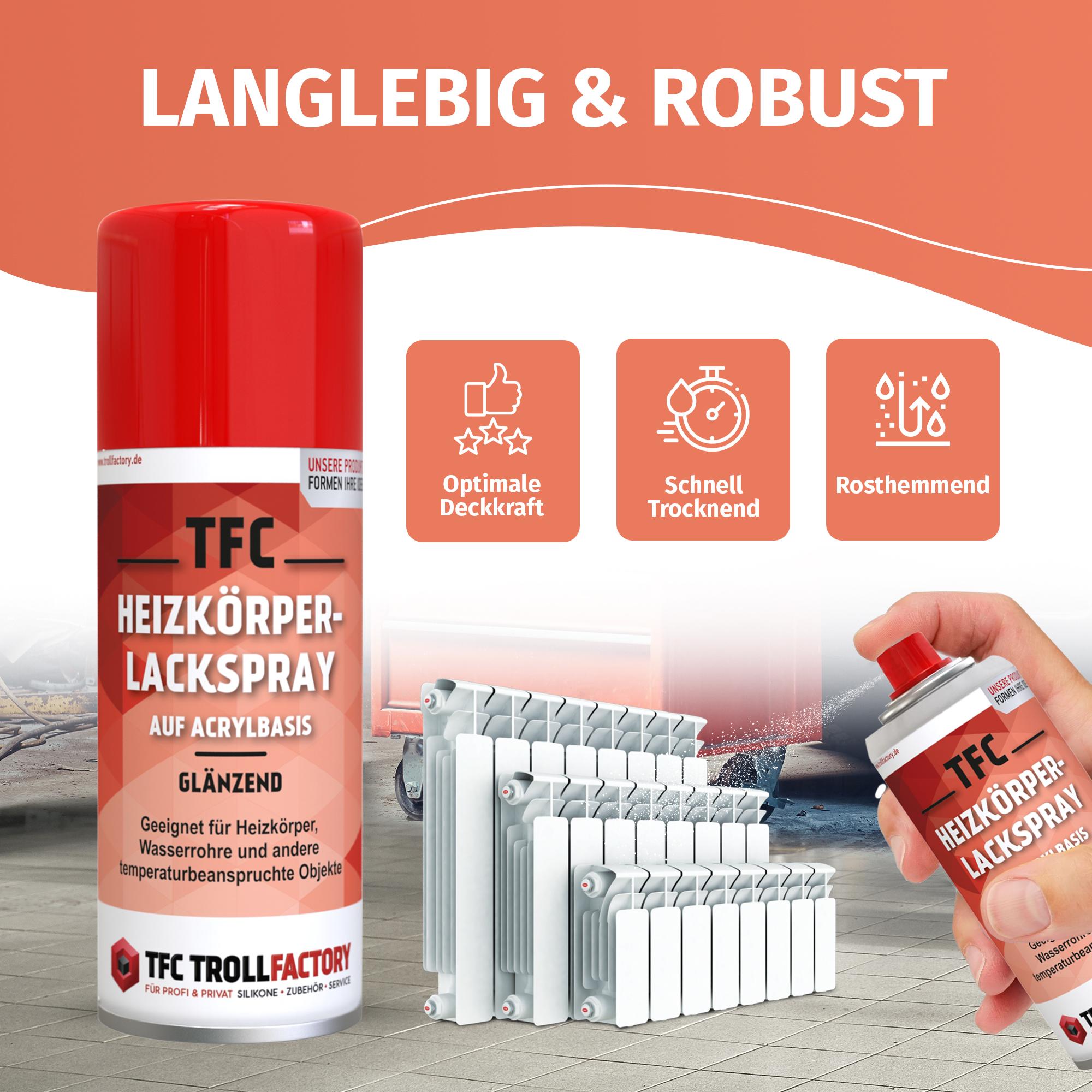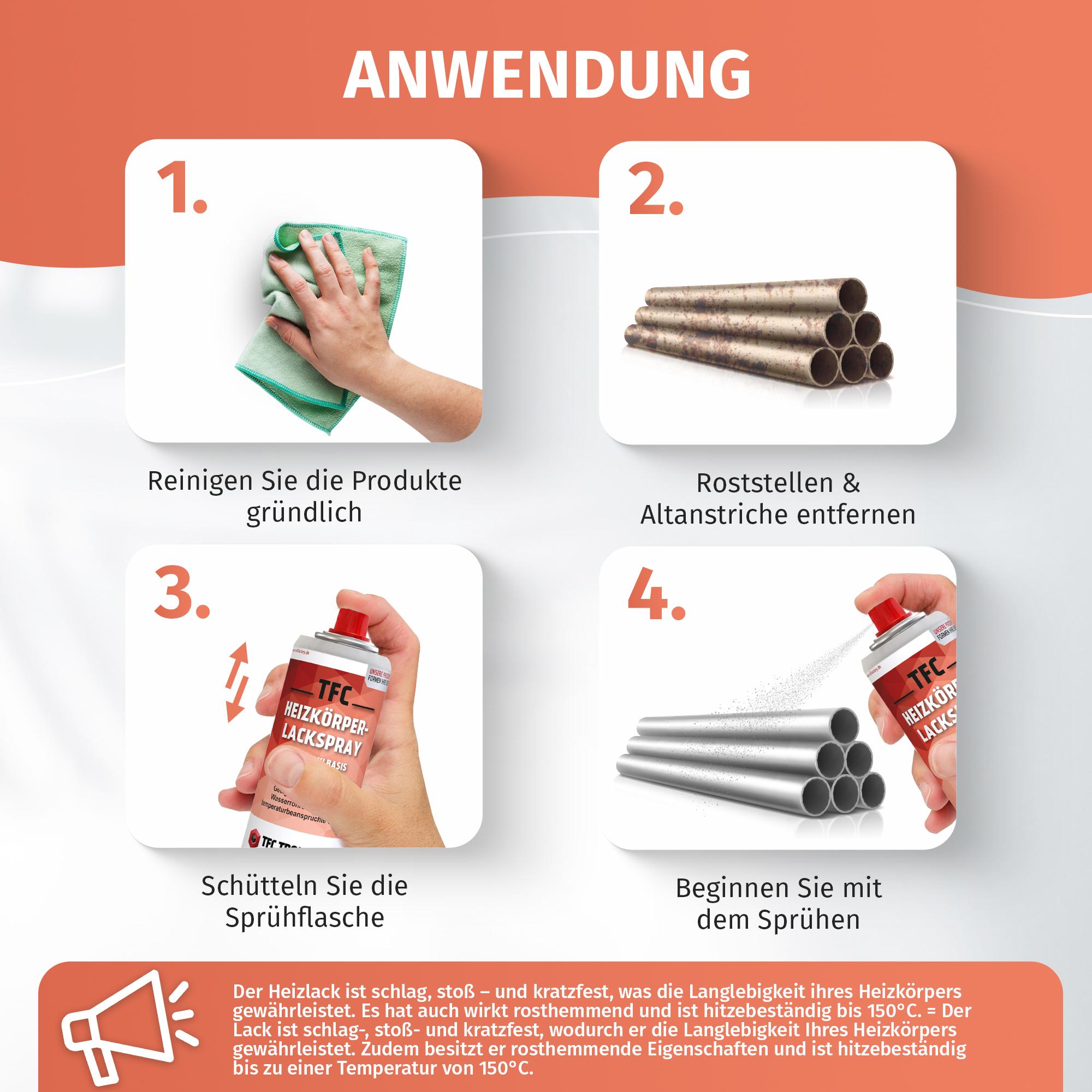 - 💫 Einfache Anwendung: Unser TFC Heizkörperlackspray auf Acrylbasis ist einfach zu verwenden. Es fungiert als Grundierung und Lack in einem, spart Zeit und sorgt für eine hervorragende Kantenabdeckung.