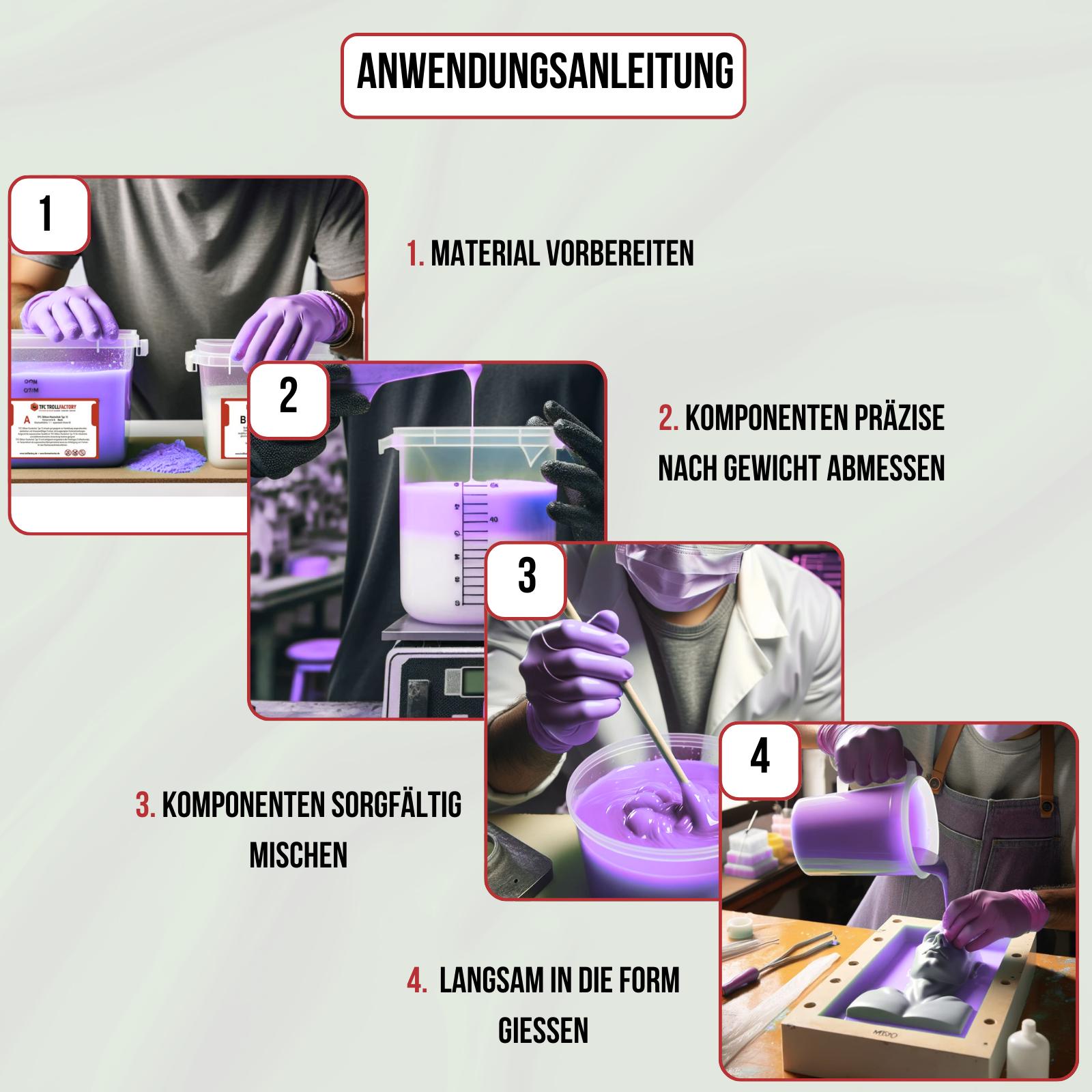 Hierbei sollten Sie vor dem Eingiessen die Form mit einem Trennmittel vorbehandeln,da Giessharze nach mehrmaligem Giessen zur Versprödung der Form führen können.