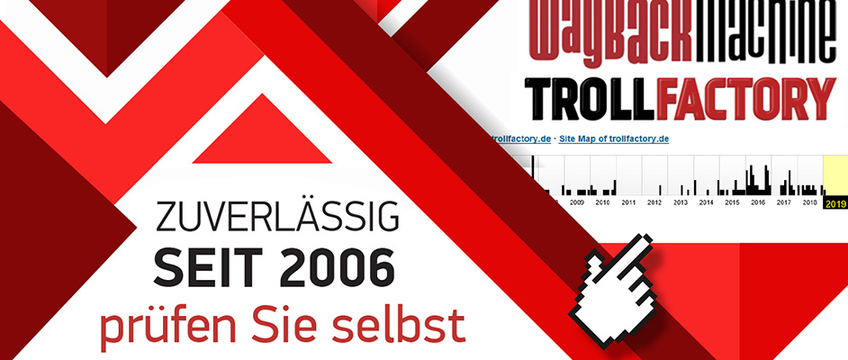 TrollFactory besteht nun schon seit 2006 und auch wir sind in diesem Internet-Archiv vertreten. Klicken Sie einfach auf das untere Bild und durchforsten Sie das Archiv von TrollFactory: