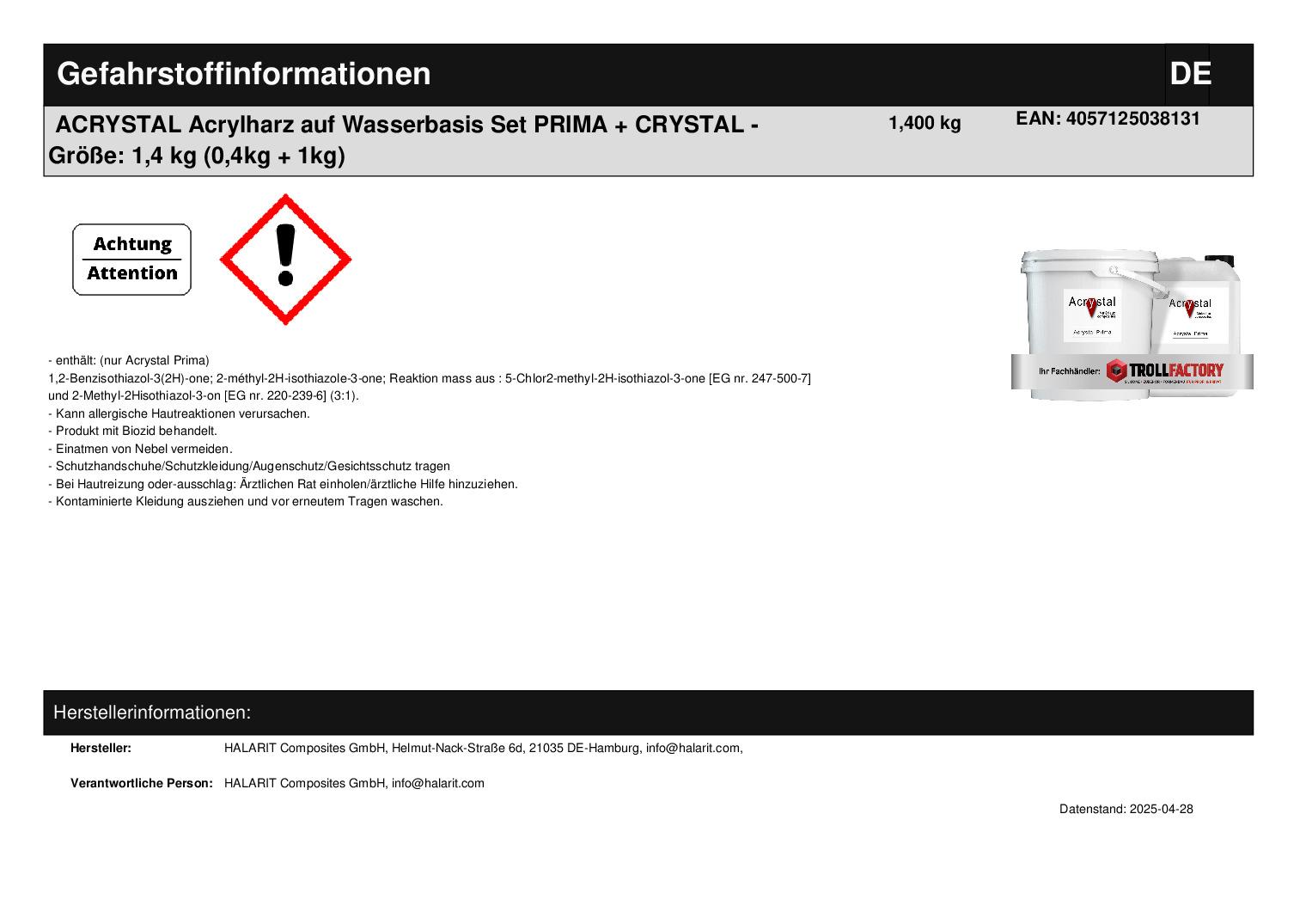Produktinformationen "ACRYSTAL Acrylharz auf Wasserbasis Set PRIMA + CRYSTAL - Größe: 1,4 kg (0,4kg + 1kg)"